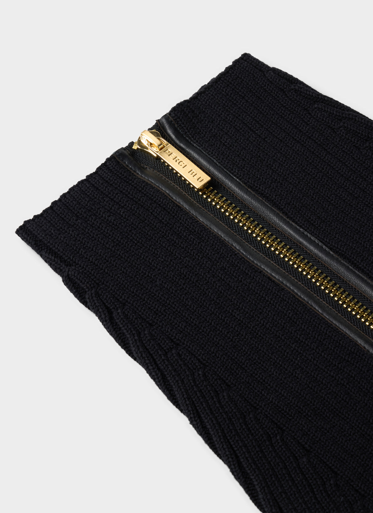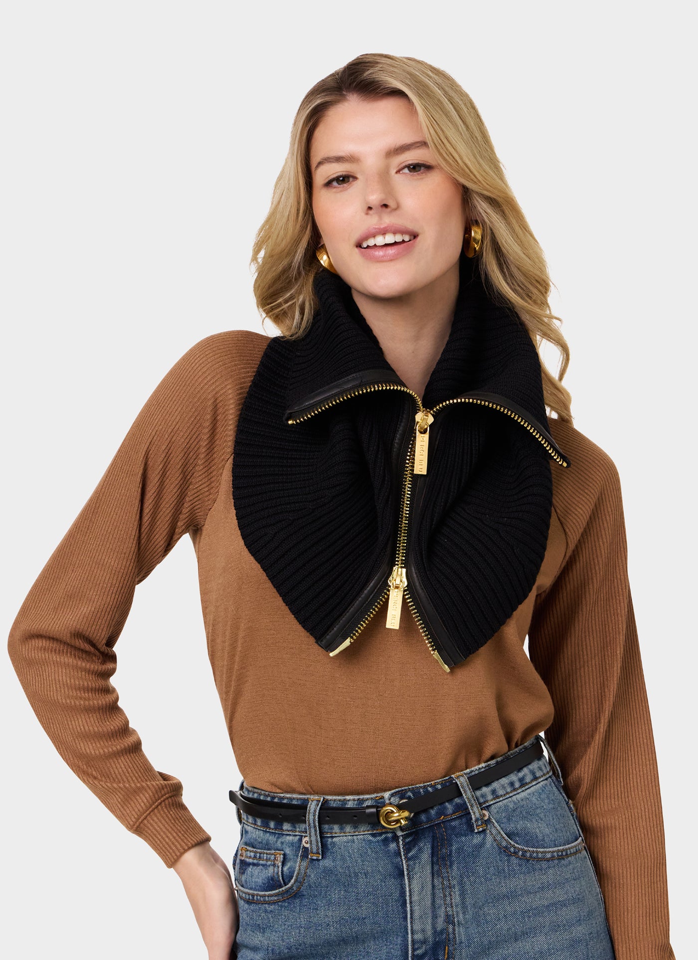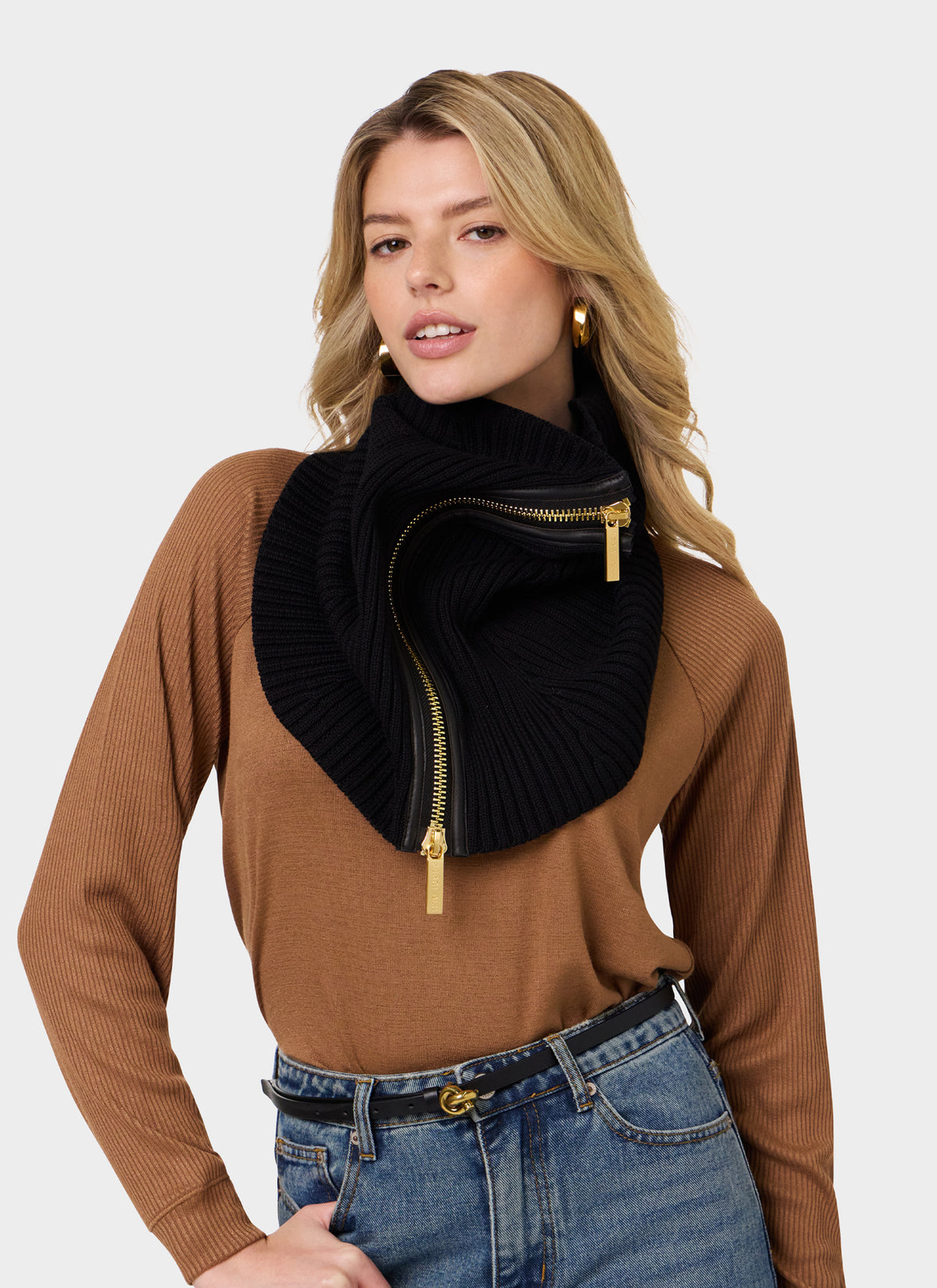 Made of 100% mercerized cotton, our scarf has a sheen, durability and luxurious feel that goes beyond regular cotton. More beautiful details abound: soft trim made of sheep leather, a statement zipper in brushed gold / lustrous nickel, and a fishtail silhouette for organic draping.