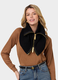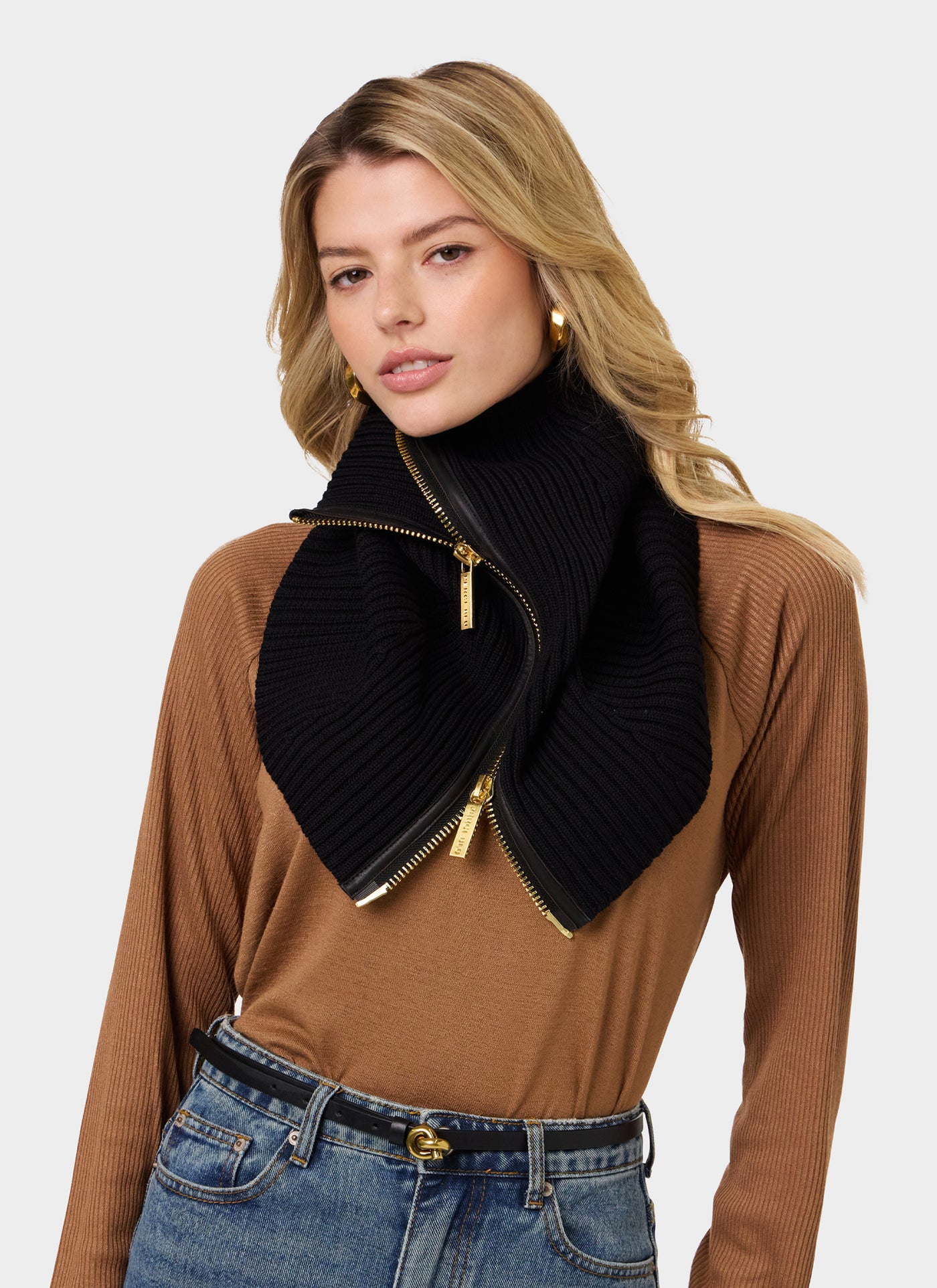 A showpiece metallic zipper runs the length of the scarf and isadjustable on both ends. Two pull tabs feature Perci Blu engraving.
