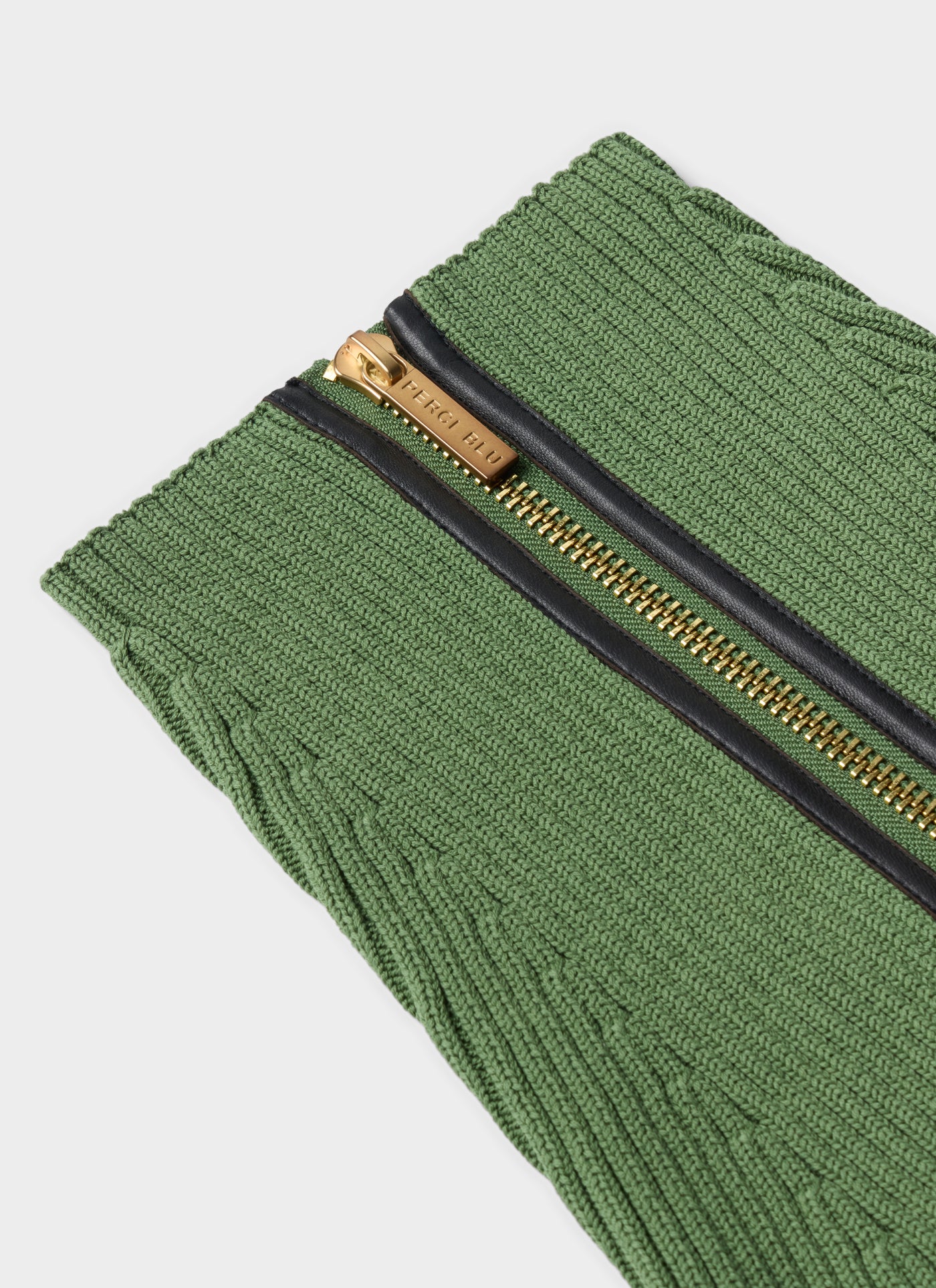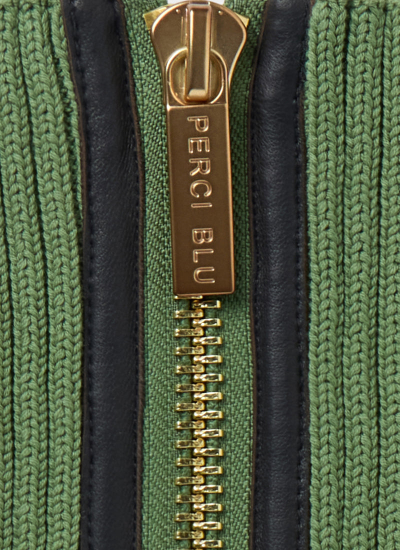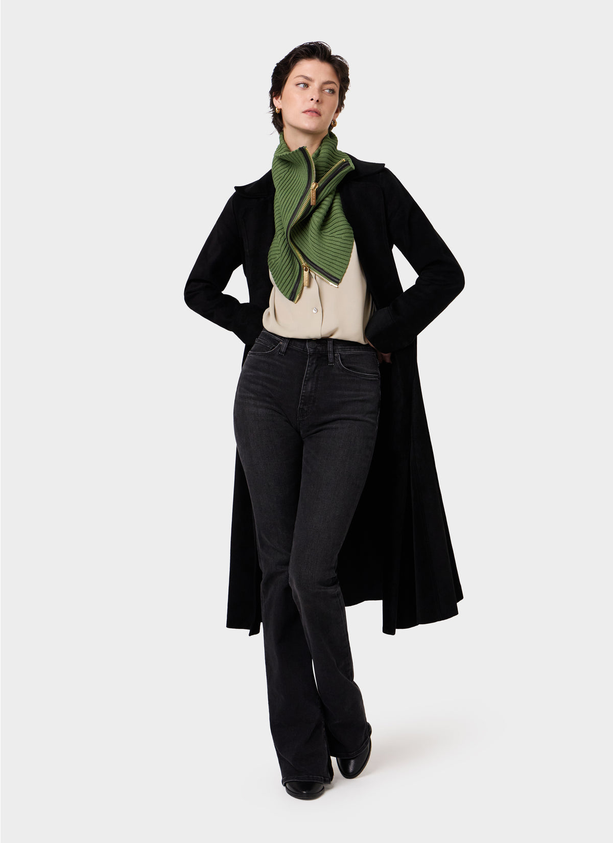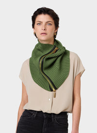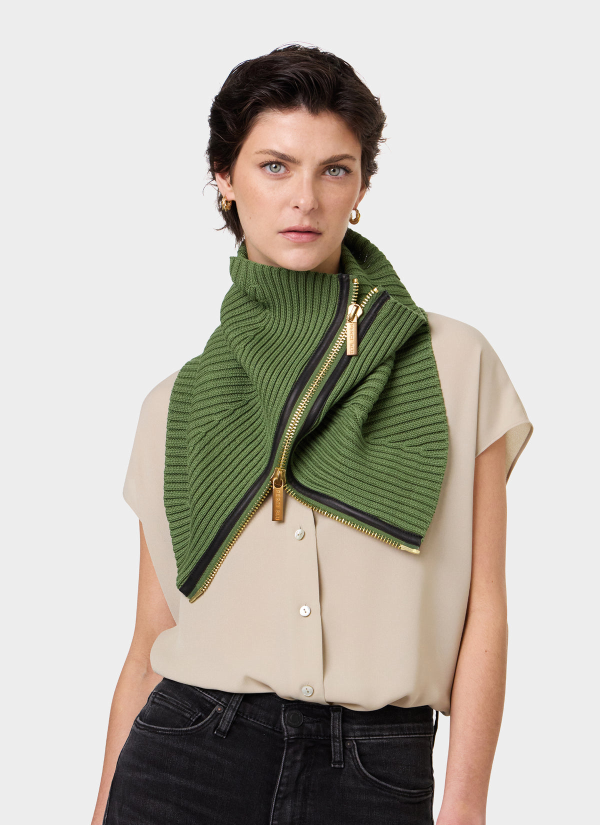 Made of 100% mercerized cotton, our scarf has a sheen, durability and luxurious feel that goes beyond regular cotton. More beautiful details abound: soft trim made of sheep leather, a statement zipper in brushed gold / lustrous nickel, and a fishtail silhouette for organic draping.